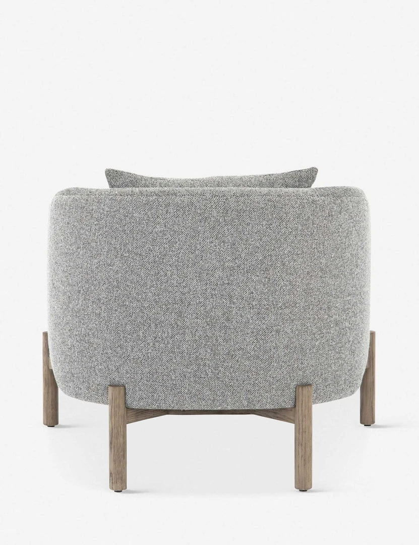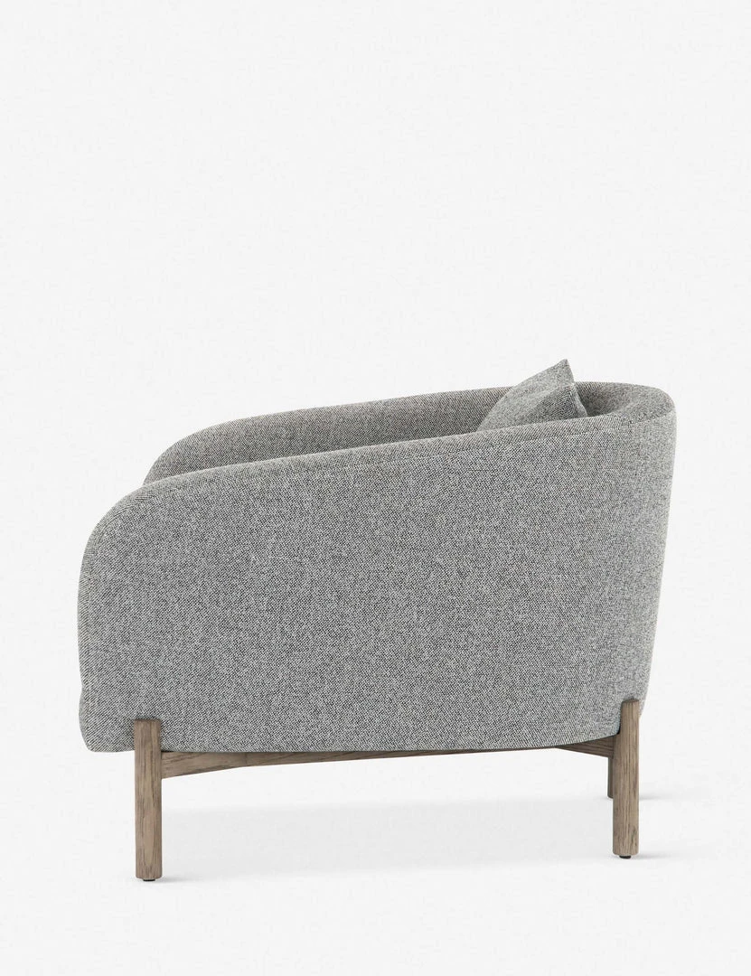 This accent chair is a billowy, modern update on traditional barrel seating with its oak wood dowel base, cozy back cushion, and tweed-like upholstery. Wrapped in a textured fabric, with interwoven black, white, and gray yarns creating a striking heathered effect. Place this occasional chair in your living room, bedroom, or home office.