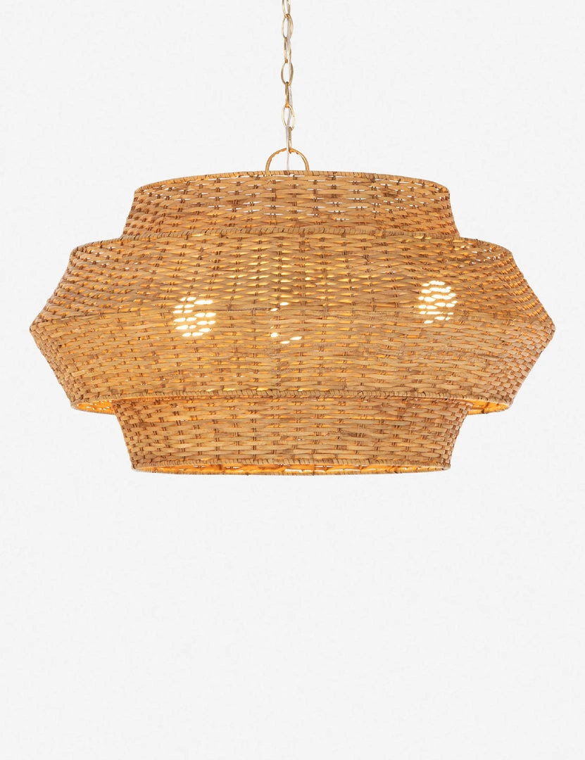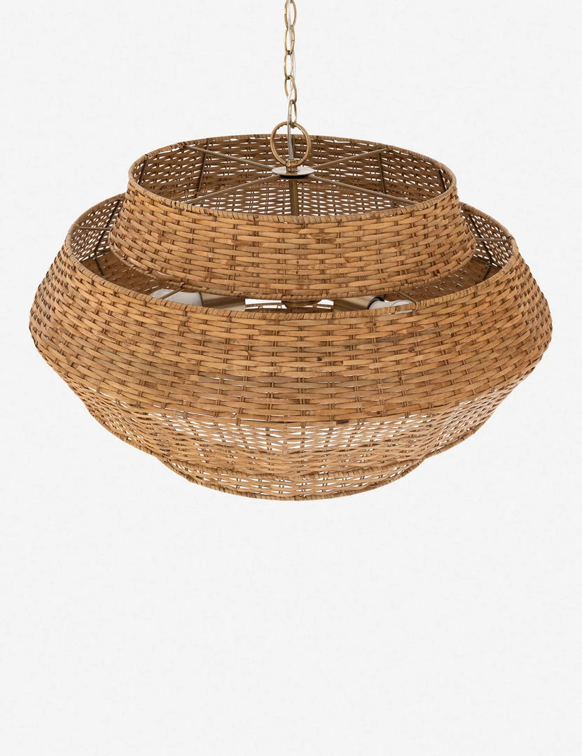 This beautiful rattan pendant light fixture features a shapely drum-style shade with layers of natural woven texture. Ideal as a centerpiece pendant to hang above a dining room or kitchen table, plus, a brass-finished chain offers a refined finishing touch.