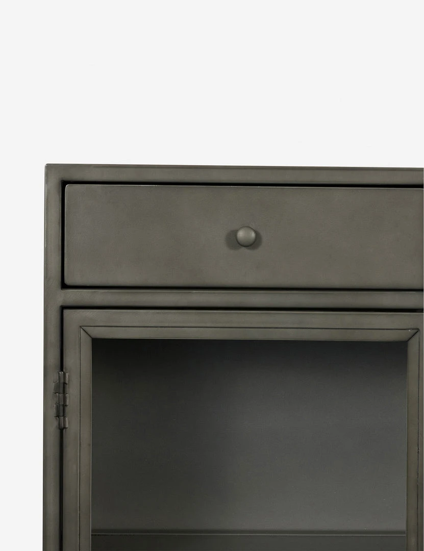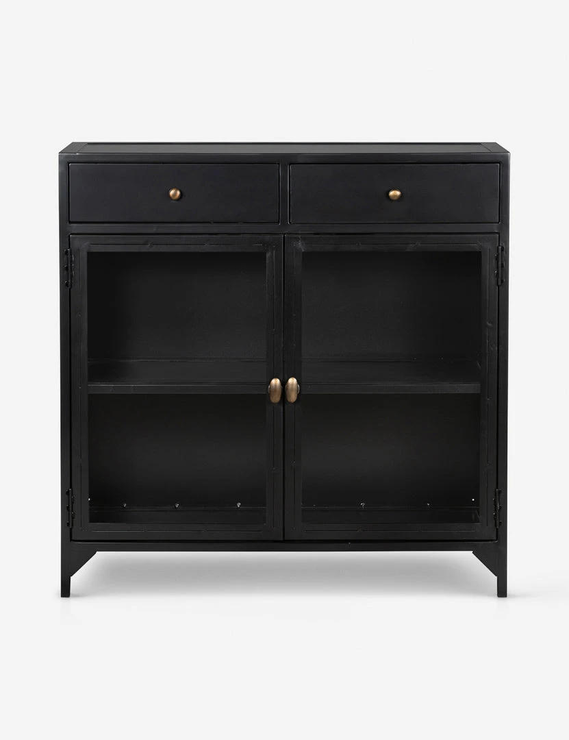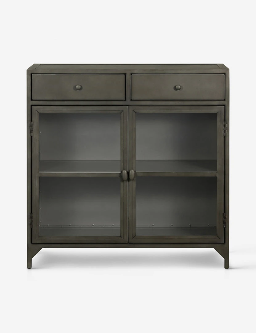 In a sleek nod to a shadow box design, this cabinet features an iron frame with glass doors for storage and display. The Malcom Small Curio Cabinet offers two drawers and shelving for a clean look with an industrial edge.