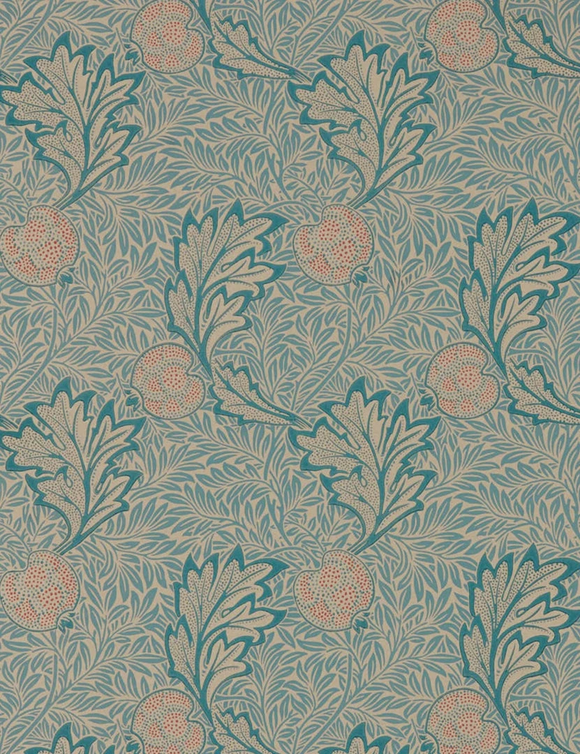 Scrolling acanthus leaves and freckled apples are the prominent focal points of this refreshing wall art. Designed in the late 19th century by Arts & Crafts textile designer William Morris, this wallpaper was used to decorate his daughter’s workroom in her Hammersmith home located in London, England. The “Acanthus” motif holds particular value as it was the first pattern released by Morris & Co. in 1884. It holds the title for the designers most recognizable pattern due to its intricate layering of entangled foliage and its three dimensional character.